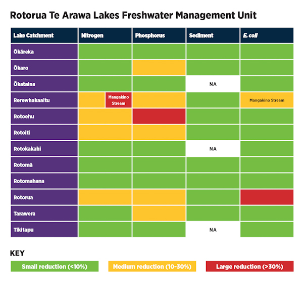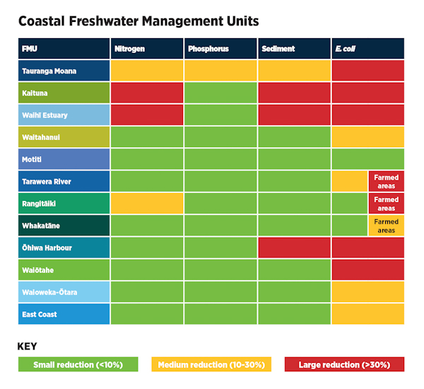 The tables below show an indicative scale of the contaminant load reductions needed to meet draft environmental outcomes for water quality and ecosystem health in each Freshwater Management Unit. These are current as at 1 October 2025.