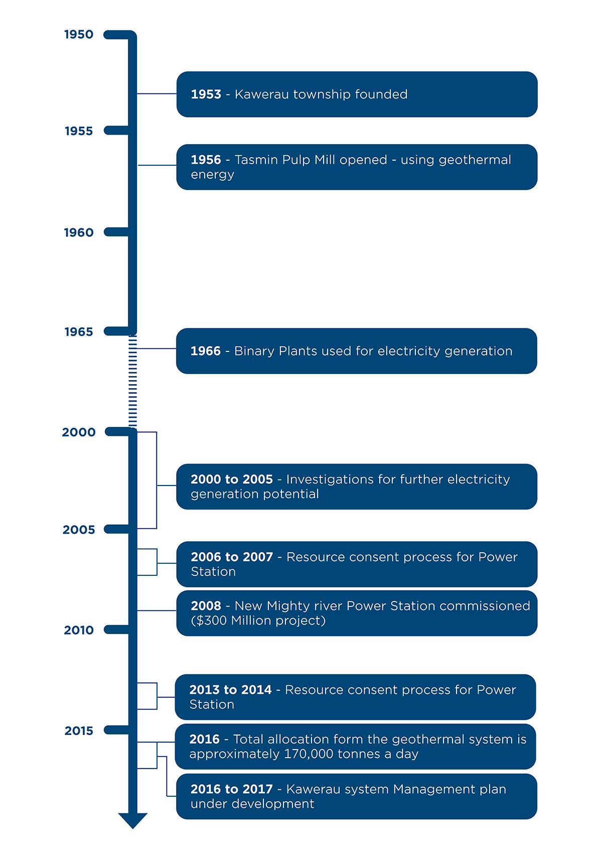 The Kawerau Geothermal System is based on the inferred resistivity boundary extending over an area of approximately 35km2. The system has been developed since the 1950s and understanding of the system has evolved over nearly 70 years. The Kawerau Geothermal System is the only geothermal system in the Bay of Plenty Region that has been the subject of large takes and discharges of geothermal fluid for electricity generation, and industrial direct heat purposes.