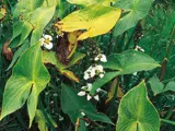 - Sagittaria montevidensis has large arrow-shaped leaves on stalks that stand up to 1m above the water.