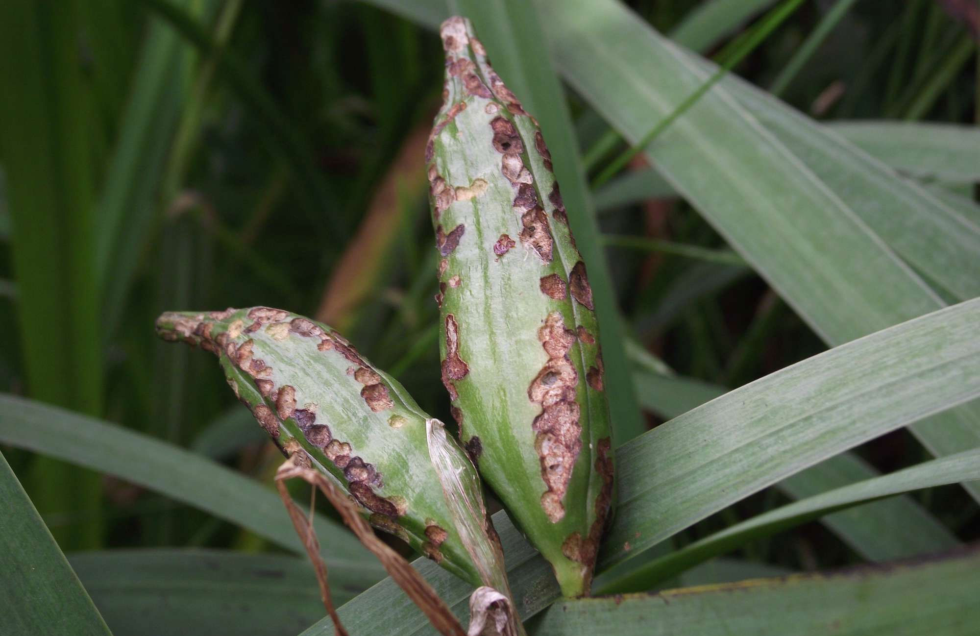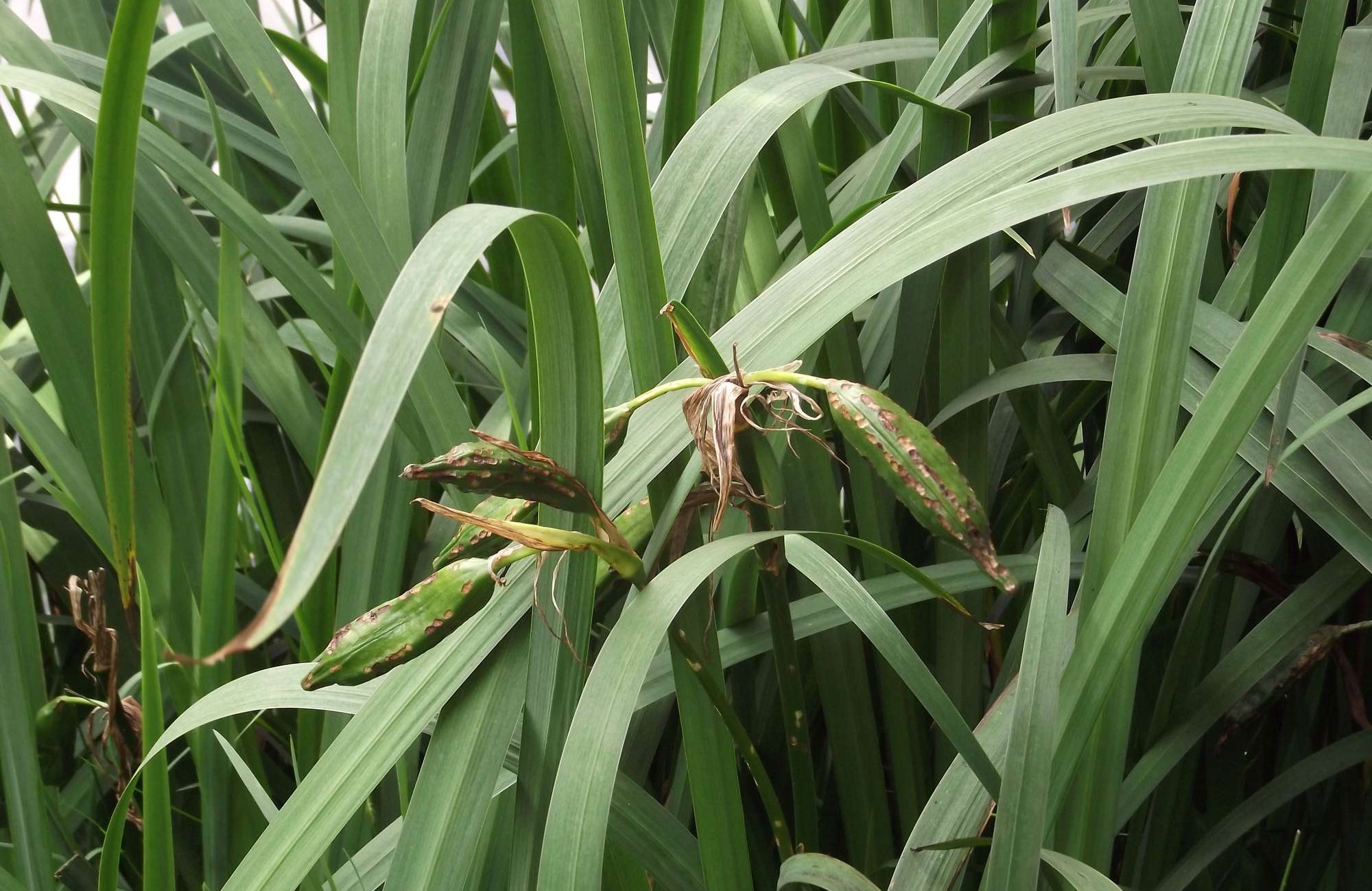 - Leaves have a distinctive mid-rib and purple colour at the base of each fan-shaped group of leaves.