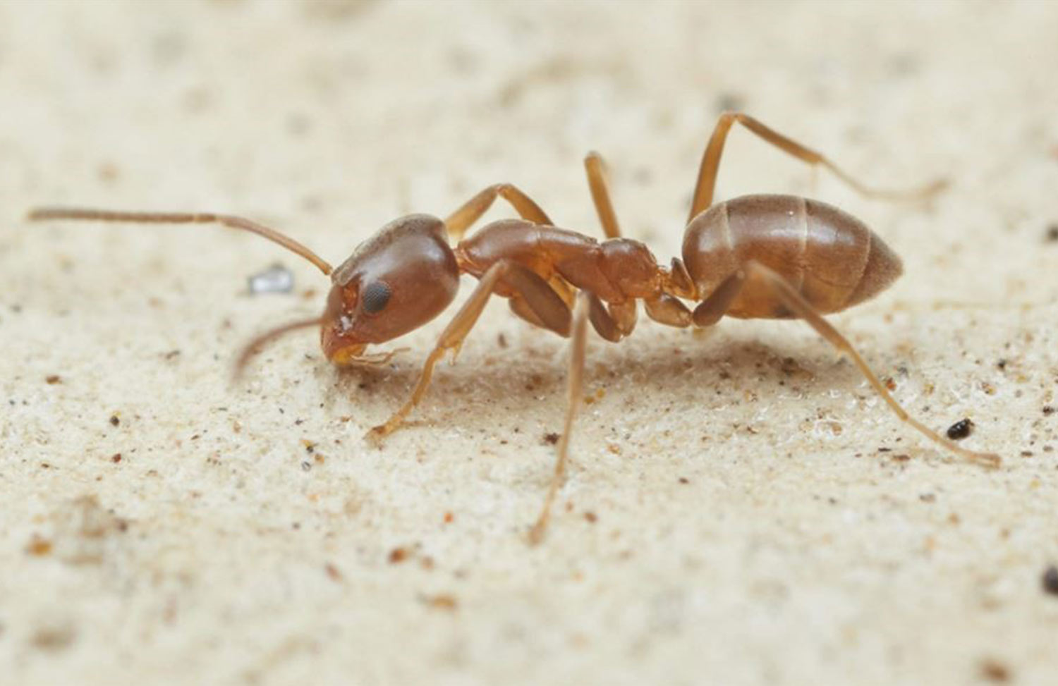 - A 2-3mm long ant with a uniform honey-brown colour.