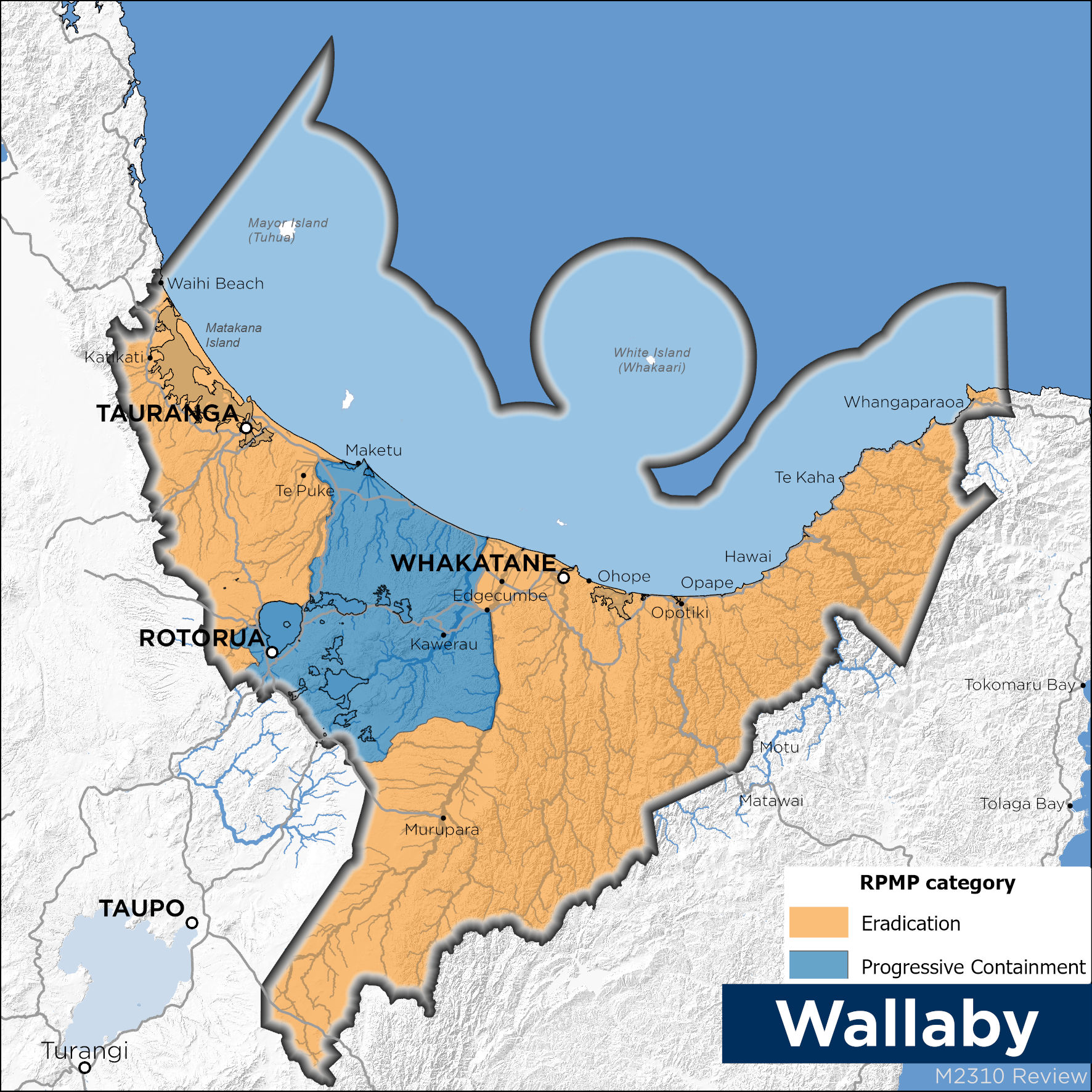 Note: The Regional Council, with support from Ministry for Primary Industries, will maintain control and management of wallaby. They are a high-risk pest but, in some areas, will not meet the eradication objective in the short-medium term, and do not lend themselves to occupier control responsibilities.
