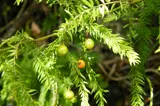 A dense scrambler with small pinkish-white flowers (October to March), red berries, long prickly stems, and sharp spiny scales.