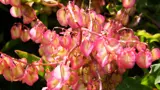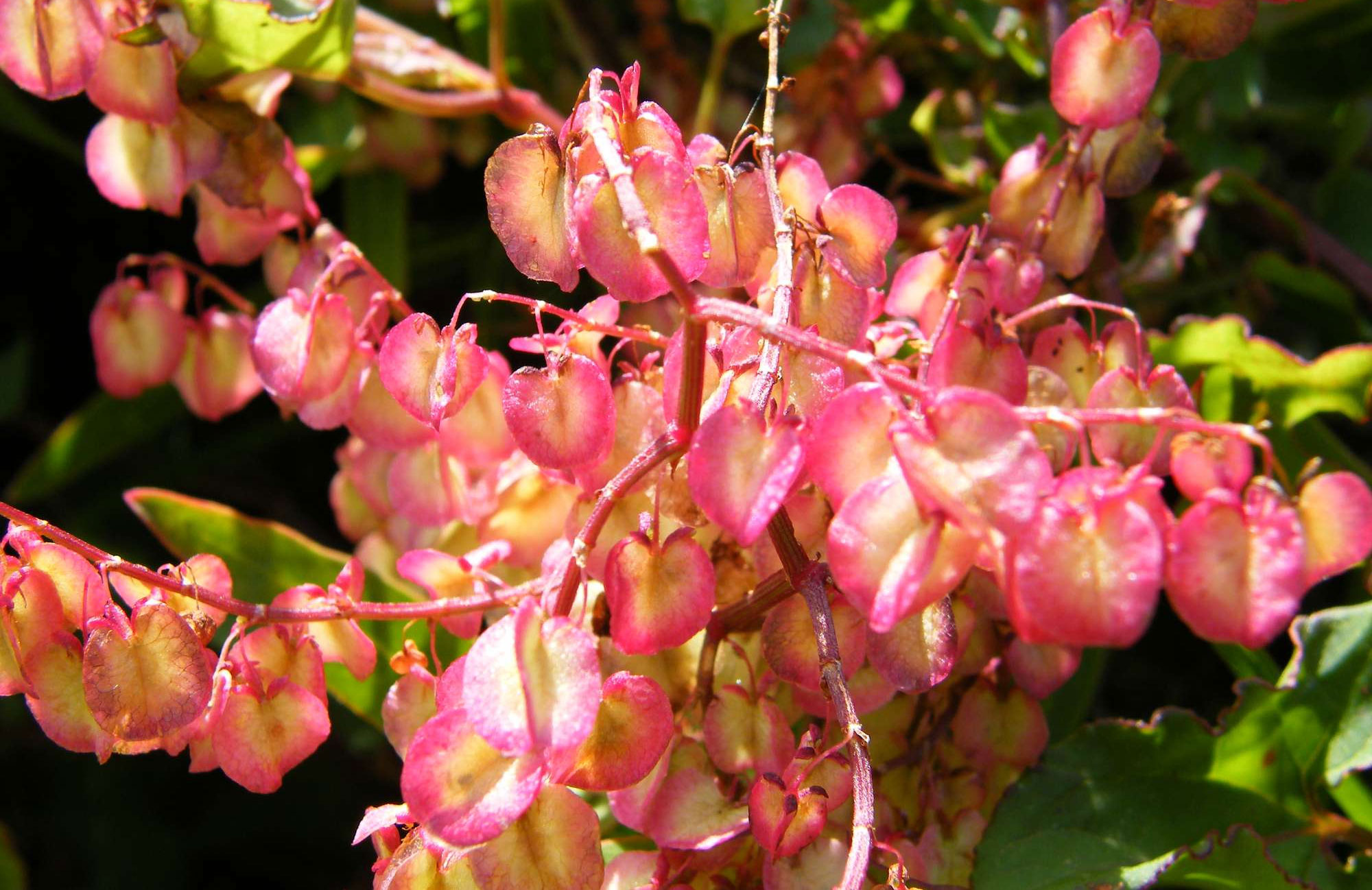 - Clusters of small, green-pink, or reddish flowers are produced at the top of the plant from November to March, followed by large masses of showy yellow-pink-crimson, flat, heart shaped capsules containing seeds.