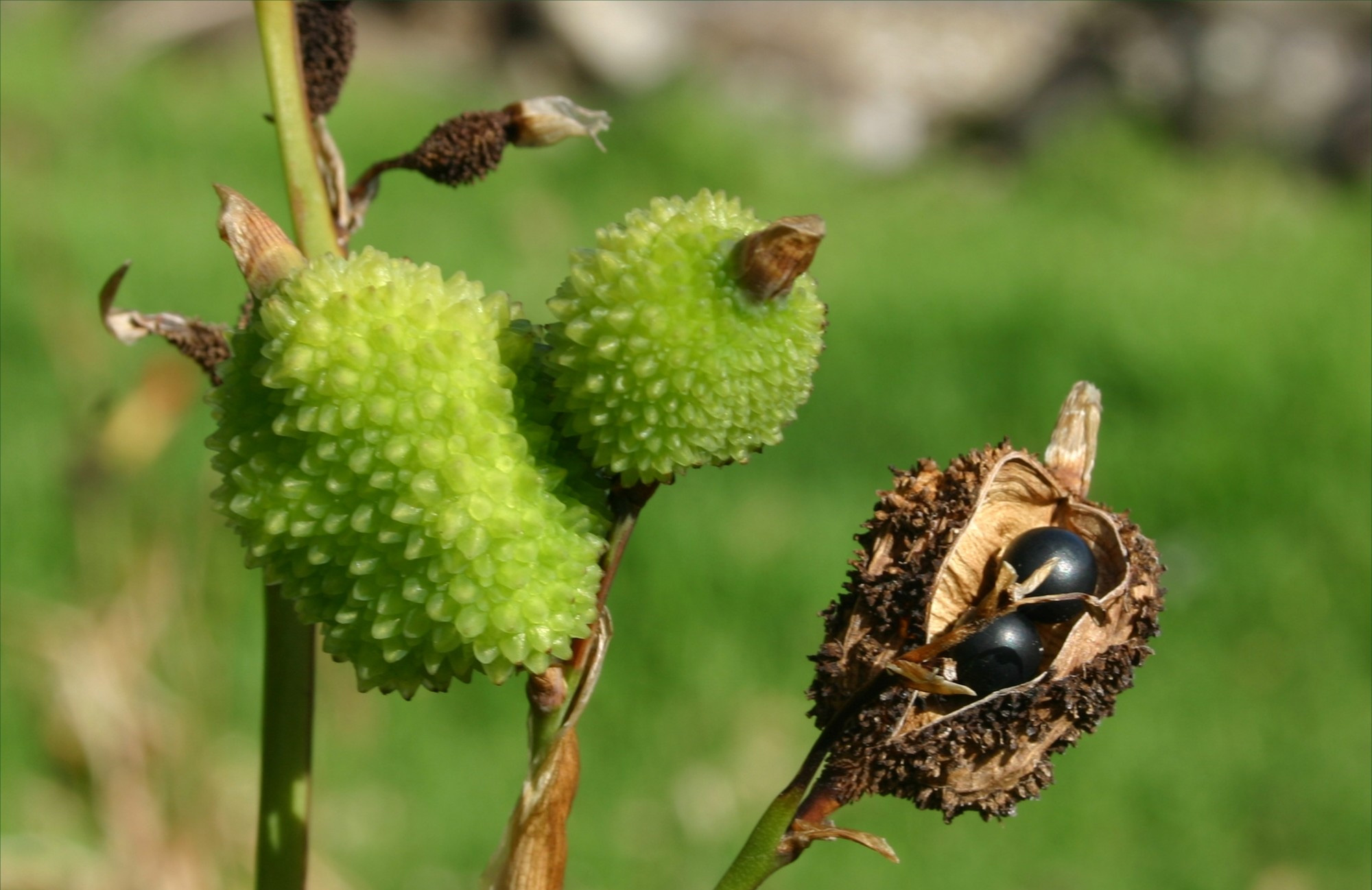 - Pinkish-red to reddish-yellow and occasionally yellow or orange-red flowers grow from the top of the stem, often in pairs, and are followed by round seed capsules containing round black seeds.