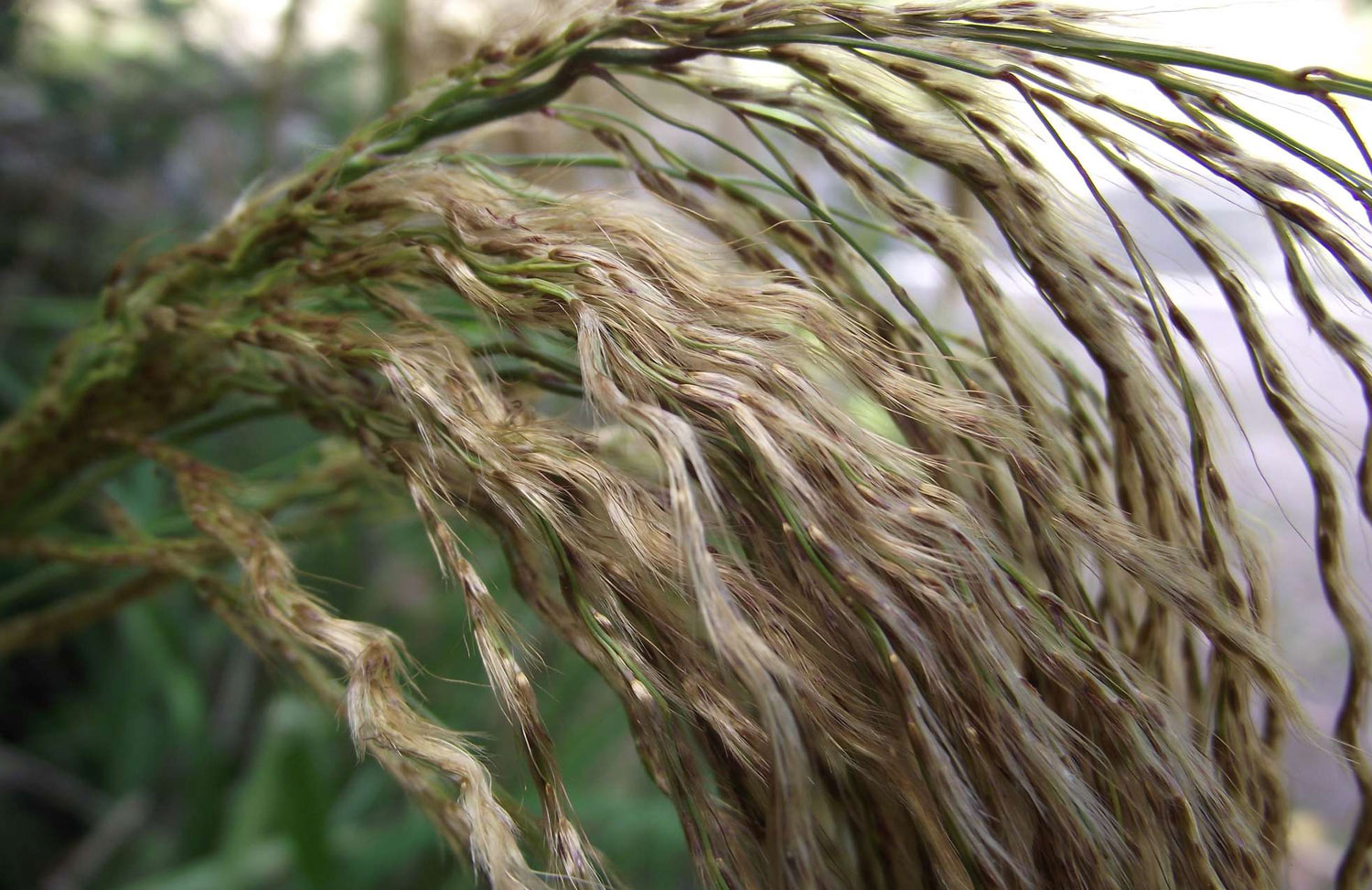 - Golden brown, drooping fan-shaped flower head on a long stem.