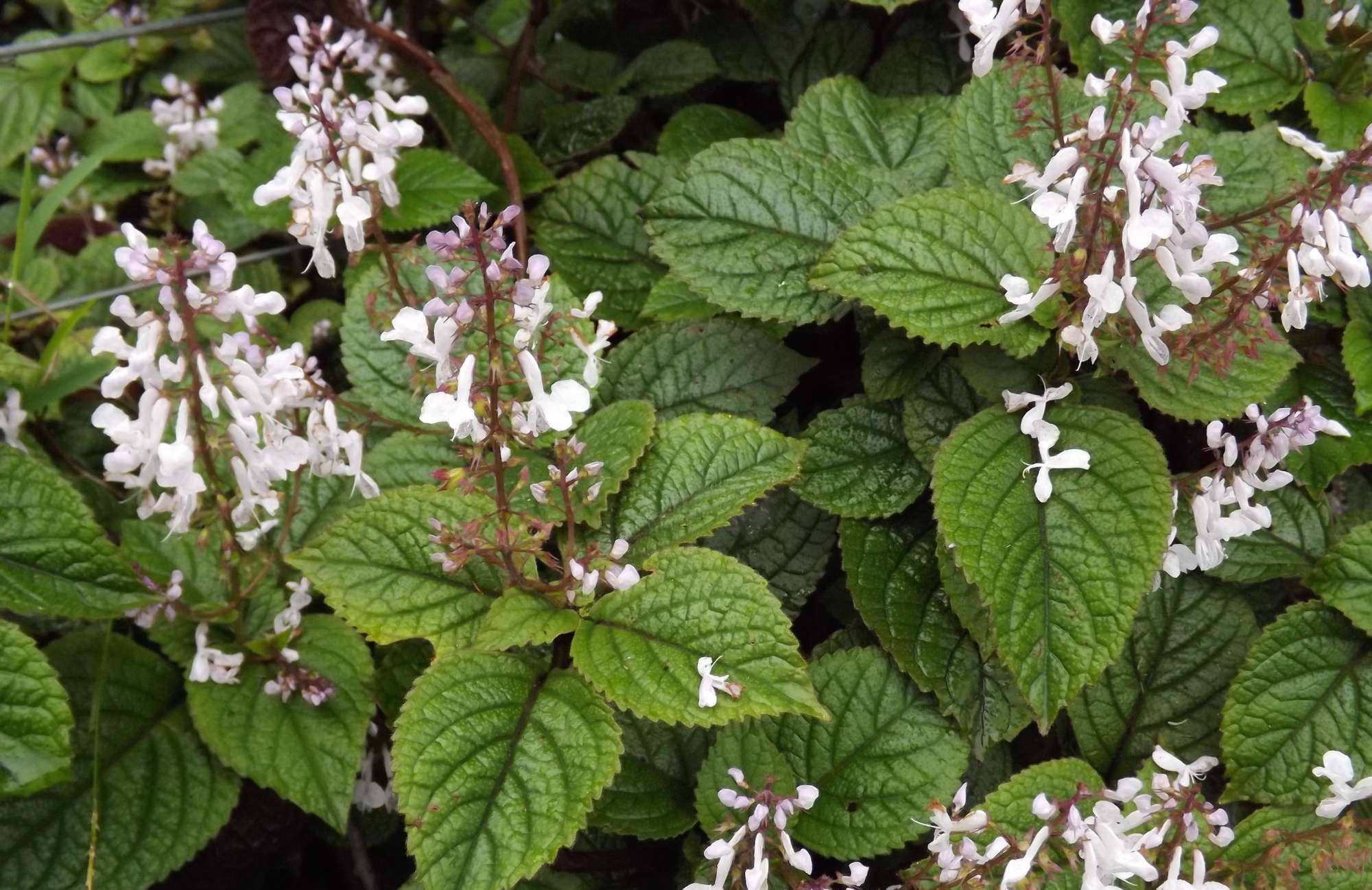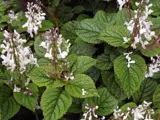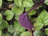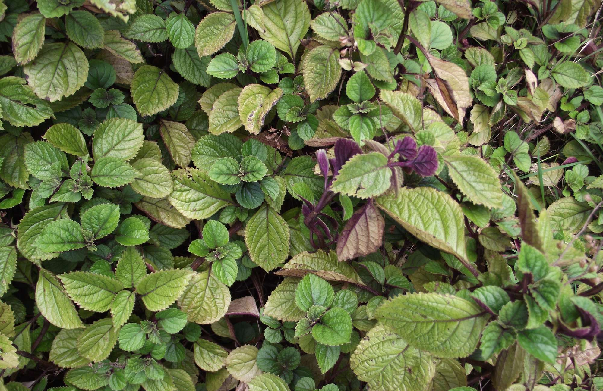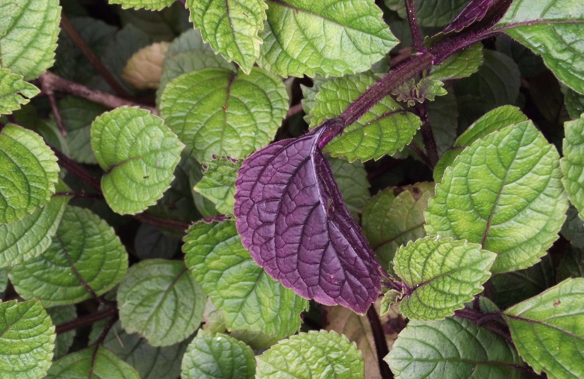 - Hairy oval, textured leaves with serrated edges are in opposite pairs and are purple underneath and dotted with glands.