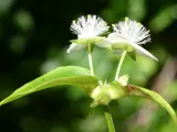 - Has white flowers (about 2 cm across) that have three pointed petals in small clusters near the tip of the branches.