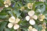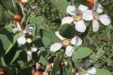 An evergreen tree with smooth bark and whitish flowers which are followed by bunches of berry-like fruit.