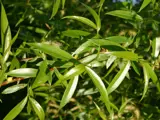 - Leaves are lance-shaped (5–15cm long and 1–2.5cm wide) with tiny serrations, deciduous, and shiny on the upper surface, hairless underneath with a bluish tinge.