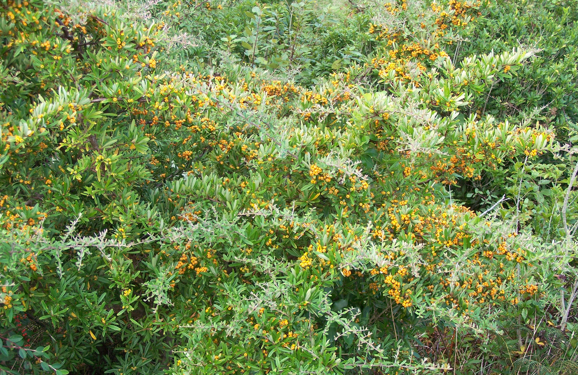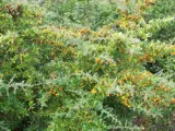 - An evergreen, spiny, spreading shrub that can grow more than 3m tall with dense, rigid, spreading stems that are grey and hairy when young, and shiny reddish brown when older, and usually tipped with a spine.