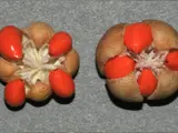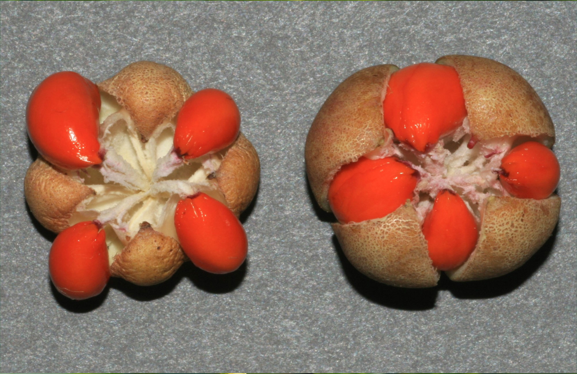 - Fleshy, round, pink seed capsule are orange or red and surround the seeds.