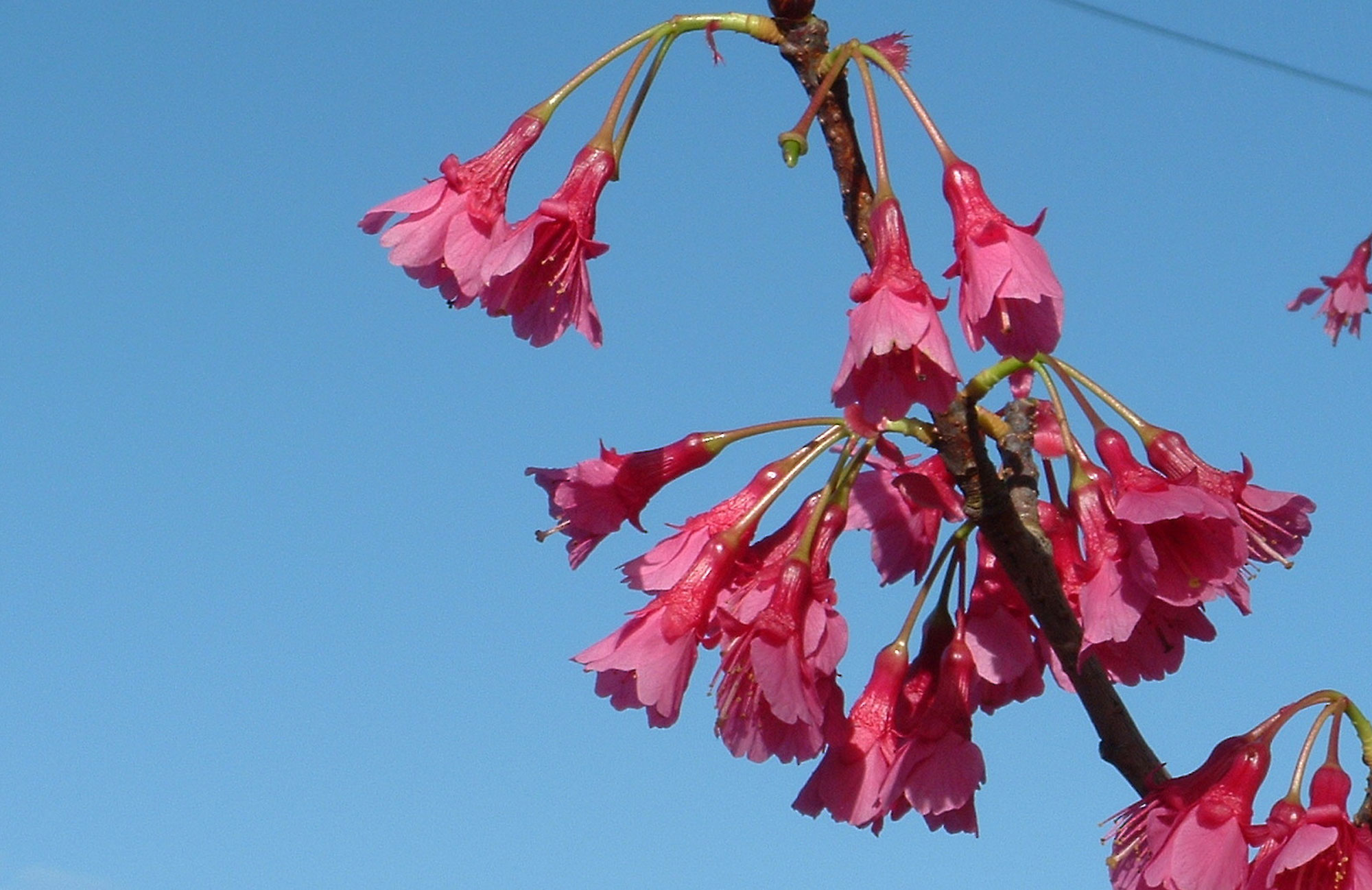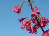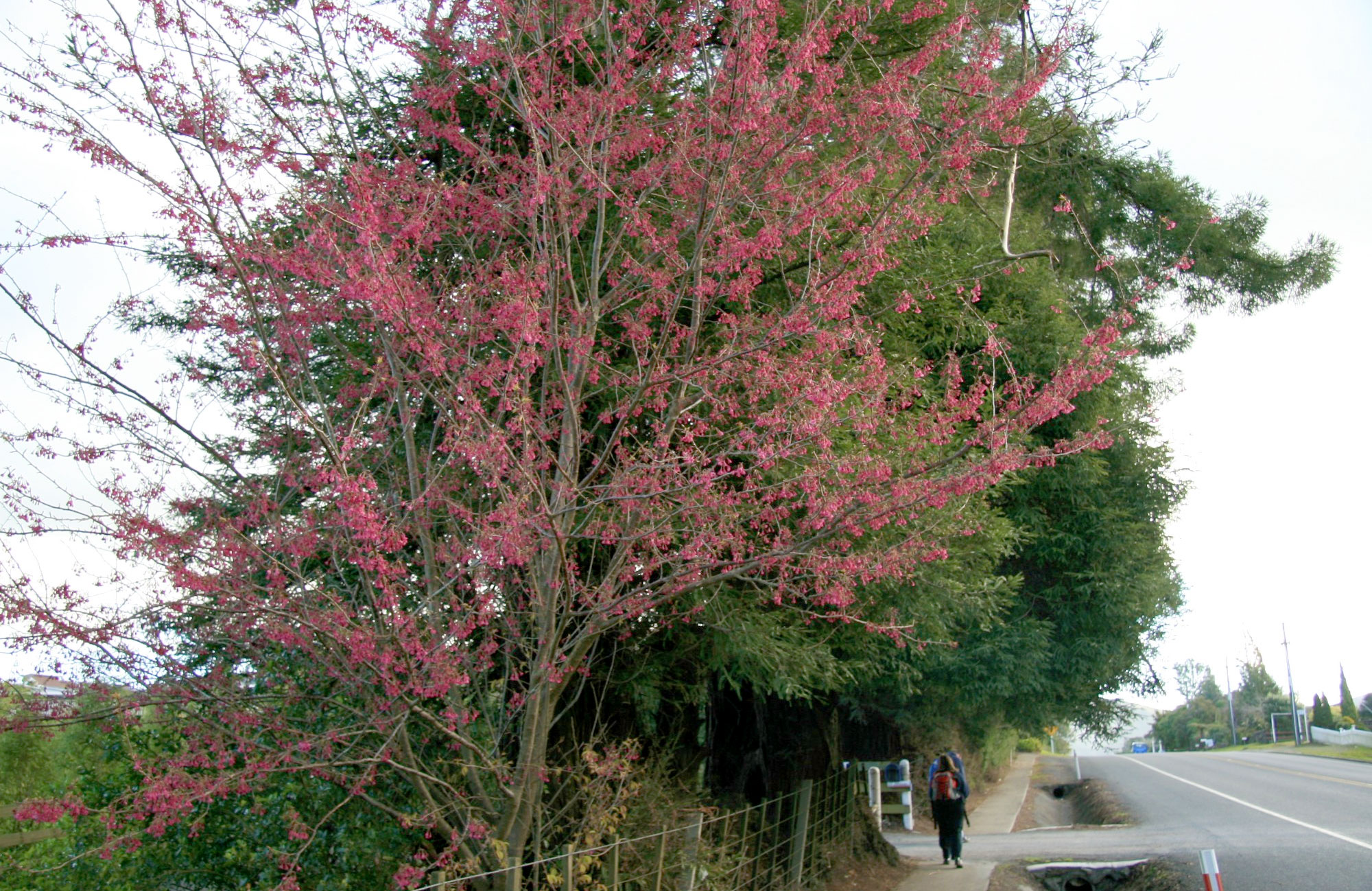- Flowers are red/pink and bell shaped and appear from July to September. The bell shaped flowers distinguish this species from other naturalised Prunus species in New Zealand.