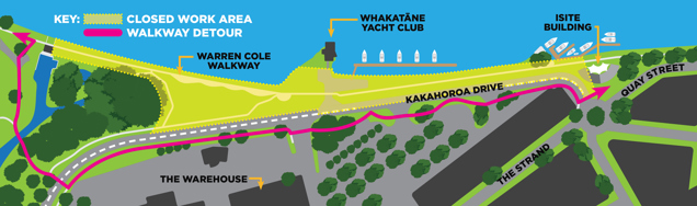 Kakahoroa Drive will be reduced to one lane from The Warehouse entrance to the roundabout by the iSite, creating a one-way system. Eastbound vehicles will be required to follow a detour through town. The carparks in this section will be inaccessible.