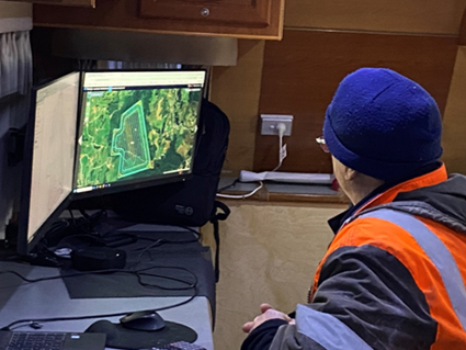 Above: Live monitoring of the aerial bait operation from a nearby caravan to ensure highest possible distribution accuracy. Credit Dale Williams