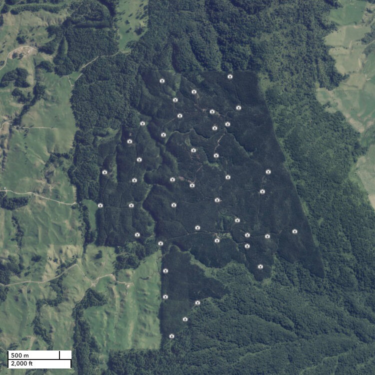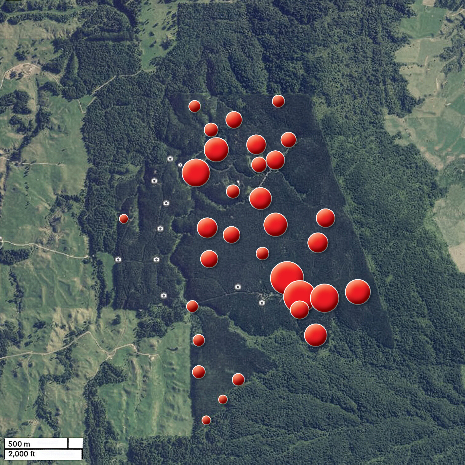 Prior to the control operation, camera monitoring has been operating for two years in the area. The monitoring revealed that wallabies were primarily confined to the pine plantation within the forest, with only one or two sightings in neighbouring native bush. This key information helped refine the final design of an aerial baiting operation, which was completed in August 2025.